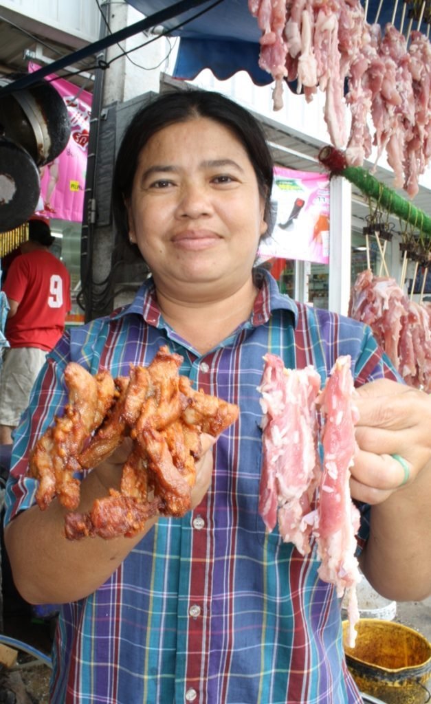 หมูทอด สูตรหมักข้าวเหนียว แดดเดียว หนึ่งเดียว ที่แม่ค้าแห่งเมืองสมุทรสงคราม คือ คุณแก้วตา กลิ่นทิพย์ แม่ค้าใจเกินร้อย อยู่บ้านเลขที่ 125/8 หมู่ที่ 5 ตำบลบางจะเกร็ง อำเภอเมือง จังหวัดสมุทรสงคราม เปิดเผยสูตรอย่างเต็มใจ ว่า เธอเป็นแม่ค้าตัวจริง เจ้าของสูตร “หมูทอดหมักข้าวเหนียว” ที่ได้รับความนิยมจากผู้ซื้อ มาระยะเวลาเกือบ 2 ปีแล้ว ขายอยู่ที่หน้าวัดศรัทธาธรรม อ.เมือง จ.สมุทรสงคราม ในแต่ละวันขายดี ใช้หมูสด ถึง 40 กิโลกรัมต่อวัน